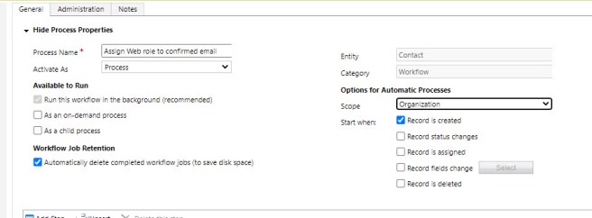 The missing part of the puzzle is of course how to assign the Web Role to newly registered portal users once and only once they have confirmed their email. To do this, you can create a traditional workflow to assign the web role to the user. This workflow will be triggered on update of any contact record’s “email confirmed” boolean value to true. This boolean value is set when the user confirms their email. When the Value changes, the workflow will fire and associate the Web Role to the contact.