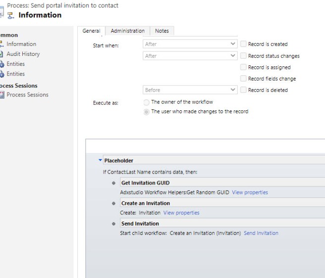 We can create a new workflow that uses a flag on the contact record to indicate that the contact was created on the Portal, so invitations won’t get sent to contacts automatically whenever a contact is created in the backend. We can of course manually send invitations still, so that resolves the case of needing to send an invite to a contact that was created manually. Alternatively, we can just call the OOTB Send portal invitation to Contact workflow which does everything we need.