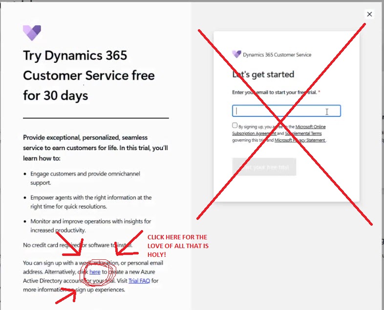 Yet, I keep coming across people who either don’t know about signing up for a trial, or – and this is the part they have trouble expressing – they don’t know how to do it the right way. That’s the part that people get stuck on, because there’s actually a secret sauce for getting yourself a useful environment on-demand for learning and experimentation. They try to sign up and run into roadblocks – Like a message saying their email is already in use, or that they don’t have permissions to add a trial to their tenant.