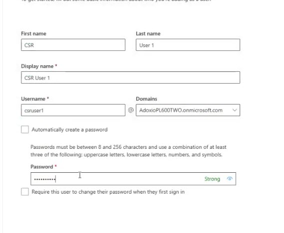 - Generate username, domain, and password. I like to set a known password (no “change password on first sign-in”) so I don’t trip over myself later.