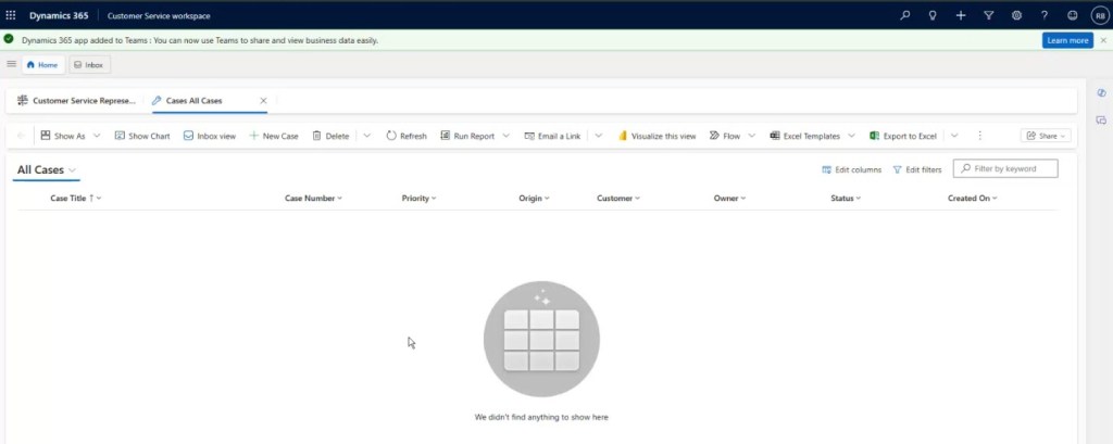 This user now has access to every case in the system. Note that the app being used is Customer Service Hub, not Workspace. So that’s interesting. And the Workspace App still doesn’t show up when you try to pick it from the app picker. But at least we can get to the cases using CSH, which we now have access to.